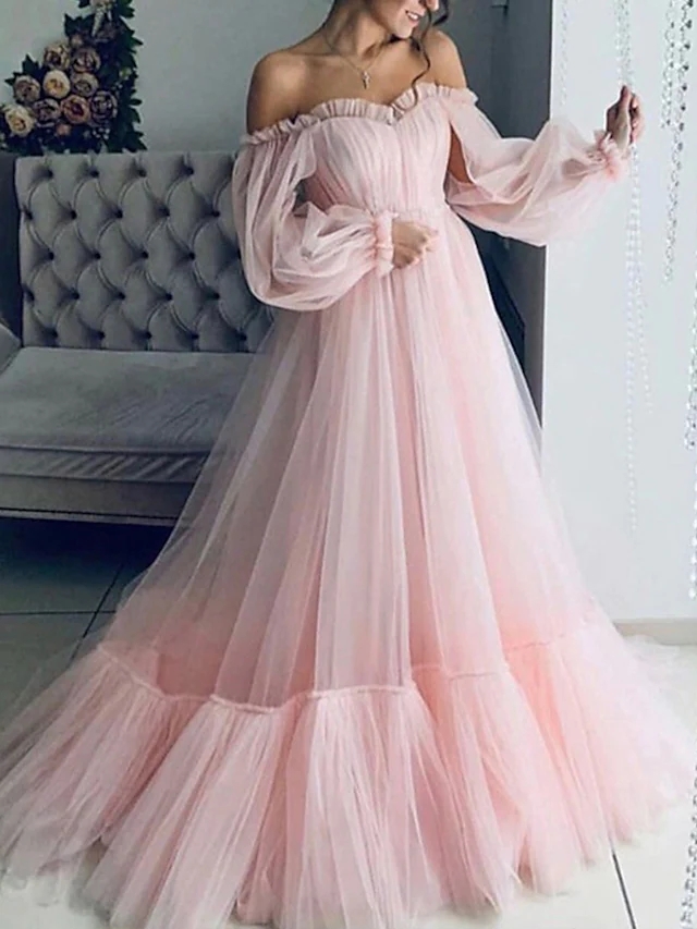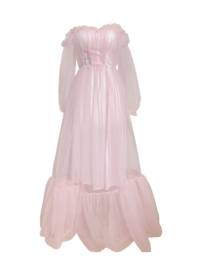 > Full dress > Women's Swing Dress Maxi long Dress Light Pink Light Blue Long Sleeve Pure Color Ruched Mesh Fall Winter Off Shoulder El